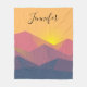 A blanket with a graphic illustration featuring many mountain tops with bright yellow sunlight setting behind the mountains. Made with geometric polygonal shapes.Simple minimalist design. Colors range from dark blue to desert red.