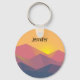 A keychain with a graphic illustration featuring many mountain tops with bright yellow sunlight setting behind the mountains. Made with geometric polygonal shapes.Simple minimalist design. Colors range from dark blue to desert red.