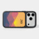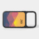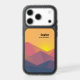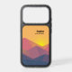 Otterbox phone case with a graphic illustration featuring many mountain tops with bright yellow sunlight setting behind the mountains. Made with geometric polygonal shapes.Simple minimalist design. Colors range from dark blue to desert red.