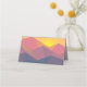 Place cards with a graphic illustration featuring many mountain tops with bright yellow sunlight setting behind the mountains. Made with geometric polygonal shapes.Simple minimalist design. Colors range from dark blue to desert red.