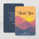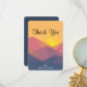 Flat thank You card with a graphic illustration featuring many mountain tops with bright yellow sunlight setting behind the mountains. Made with geometric polygonal shapes.Simple minimalist design. Colors range from dark blue to desert red.