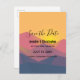 Save the date wedding postcard with a graphic illustration featuring many mountain tops with bright yellow sunlight setting behind the mountains. Made with geometric polygonal shapes.Simple minimalist design. Colors range from dark blue to desert red.