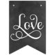 Custom Mr and Mrs wedding bunting banner features a monogram letter that can be customized with the bride and groom's married last name initial. Banner features Love in script writing along with hearts accents. White text on rustic black chalkboard textured style background.