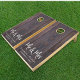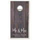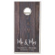 A fun cornhole game set for your wedding events and newlywed life. This rustic design features a dark faux wood background with "Mr & Mrs" written in a large white script. Personalize with your first names and wedding date in simple white typography, and select your bean bag colors.