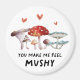 Funny magnet design featuring watercolor illustration of mushrooms with a text that says "you make me feel mushy"