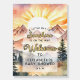Boho and rustic gender-neutral baby shower design "A little ray of sunshine is on the way" with a watercolor style landscape with mountains, fir trees, and a rising sun.