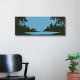 A graphic landscape wall art including a rustic nature scene with body of water in black and blue colors. Perfect for home or office decoration.