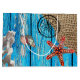 A rustic background texture of blue wood, faux burlap, orange starfish, seashell, white coral and compass positioned in the center. A nautical design with a modern twist.