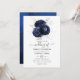Trendy navy blue and silver rose themed wedding invitation with elegant typography customizable to your event specifics.