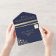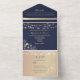 This elegant navy and gold all-in-one invitation brings rustic romance to life with glowing string lights and golden floral accents. A convenient foldable format with RSVP and mailing panel—no envelope required. Perfect for winter weddings, barn receptions, or chic evening celebrations with a cozy touch.