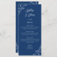 This lovely wedding reception menu card features a lovely navy blue background with hand-drawn wildflowers and elegant typography in white. Together these elements create an rustic yet elegant wedding menu that would be perfect for a romantic wedding any time of the year. This design coordinates with our Rustic Wildflowers wedding suite.