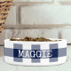 This personalized dog bowl features a navy blue and white gingham check plaid pattern with your dog's name in white retro typewriter font. The perfect pet accessory to fit in with your farmhouse decor.