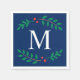 Holiday napkins feature a dark navy blue background (can be customized) and winter evergreen wreath with leaves and berries framing a white monogram initial.