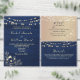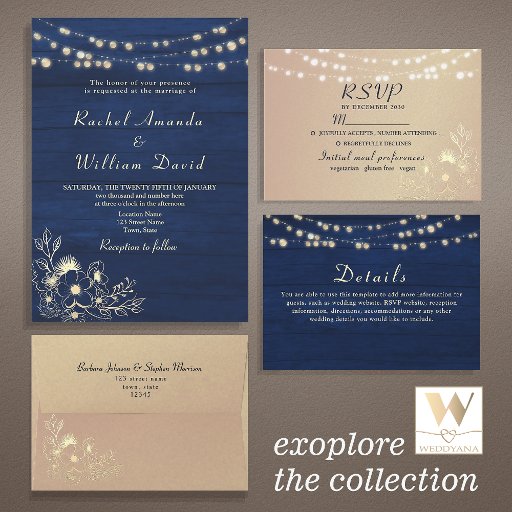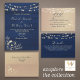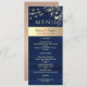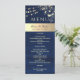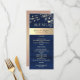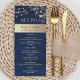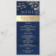 Set the tone for your celebration with this rustic navy blue and gold wedding dinner menu. Featuring glowing string lights and delicate floral accents, this elegant design blends warmth and romance—perfect for winter weddings, barn receptions, or evening events. Easily customize the menu with your wedding courses to match your personal style and theme. A charming way to add sophistication to your tablescape.