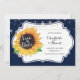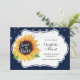 Rustic floral wedding save the date card featuring a sunflower on a white sign and navy blue burlap background.