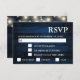 Rustic wedding RSVP card with a navy blue wood background with string lights. The date to RSVP by has a labeled text box to help you customize it for your day.