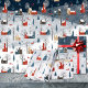 A rustic hand drawn Nordic houses mountainside village featuring roaming red foxes.
