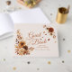 This charming, rustic, yet elegant fall wedding guest book showcases autumn flowers like roses, peonies, anemones, and chrysanthemums in brown and beige tones on a soft off-white background. Romantic falling autumn leaves evoke feelings of cozy, peaceful love that stands the test of time. The wording can be customized to fit your preferences.