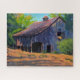 Rustic old barn on a Augusta, Missouri farm with background trees painted in rich oil painting colors of purples, blues, oranges, and greens. Designed from an original impressionistic oil painting by fine art painter Daniel Fishback.