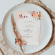 These beautiful and romantic wedding menus feature trendy boho style and elegant burgundy calligraphy. Rustic bohemian bouquets of orange, peach, blush, and taupe flowers and neutral botanical leaves decorate the corners, with matching subtle watercolor splashes on a soft blush background.
