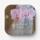 Personalize the Rustic Elegance Country Barn Wedding Paper Disposable Plates with the names of the bride and groom and date for use at your casual yet classy ranch theme bridal shower or barn party marriage reception. These informal and elegant custom nuptial disposable paper plates feature a quaint floral photograph of pink phalaenopsis orchid flower blossoms on the stem and white bridal veil with a weathered brown barn wood background.