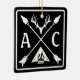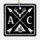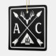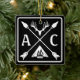 Capture the spirit of the outdoors with this rustic, custom initials ornament, featuring a striking emblem design. Two arrows cross at the center, framed by a stylized deer antler at the top and a campfire at the bottom, creating a bold and adventurous look. Between the crossed arrows, the initials "A" and "C" can be personalized with your letters, making this ornament uniquely yours. The monochromatic black and white design gives it a modern yet timeless feel, perfect for outdoor enthusiasts, campers, and hunters.