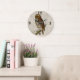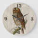 Beautiful vintage artwork of an owl sitting on a tree limb and graphically manipulated against a rustic white washed wooden looking background. Bold brown hour numbers 12, 3, 6, and 9 are around the outside edge.