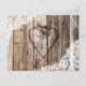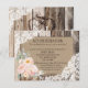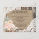 Peony floral bouquet over burlap-look pattern, white chantilly lace, and barn wood background rustic wedding accommodations card.