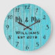 Beautiful, unique, one-of-a-kind personalized design features a faux-rustic teal blue wood with black personalization his and her names in a script font overlay design and the last name and year established in a bold script with a printed wood effect background. Personalize this clock by adding your personal information. Makes a great wedding, anniversary, or housewarming gift. Click "personalize this template" to change the names, fonts, and colors to create a unique one of a kind design. What an elegant, rustic accessory for your living room, bedroom, or family room. If you need any help with customization please email me at ybnormalone @gmail.com. Thanks for stopping by www.zazzle.com/Personal_Creations. ©Karen Hall for Personal_Creations at Zazzle.
