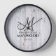 A rustic modern white washed barn wood shiplap monogrammed wedding wood framed wall clock with date established. You may choose from a natural wood, black or white wood frame to complement your home decor. Rustic modern trendy monogrammed style.
