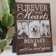 Rustic pet memorial photo plaque featuring a wood effect background, 3 photographs of your beloved dog or cat, the saying "furever in our hearts", your pets name, a white paw print, and the sympathy saying "until we meet again".