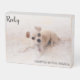 Simple modern photo wooden of a beloved pet. Featuring, you favorite photo, their name and the text 'ALWAYS IN OUR HEARTS' over a white overlay. All text font styles, size and colors can be changed by clicking on the customize further link after personalizing.