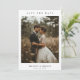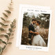 This Rustic Photo Wedding Save the Date features a romantic forest setting with the couple embracing, highlighted by a soft, natural backdrop. The design uses classic typography over the image, presenting a timeless and elegant appeal.