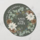 Traditional design with a modern twist. Beautiful rustic botanical frame with pinecones and white flowers is this traditional, and the round card is the modern! Upload your engagement photo for the back, along with the date and names customization.
