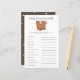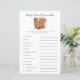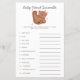 Cute bear theme girl's baby shower baby word scramble card featuring illustration of a cub with pink bow and hearts. The list of words on this card are all related to babies and they are scrambled. The guests are going to compete who can unscramble all of them first! ANSWER KEY: 1. car seat 2. milk 3. playpen 4. pacifier 5. diaper 6. rocking chair 7. nursery 8. baby monitor 9. swaddle 10. formula 11. rubber ducky 12. stroller.