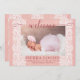 Here's a sweet, lovely way to welcome your new little princess into the world with a personalized birth announcement to send friends and family. The design includes a wonderful rustic combination of white lace and pink burlap with the word "welcome" in script lettering. Add your personal favorite newborn baby photo along with her name, birth information, and the names of the happy parents. The back of the card continues the design with pink burlap and lace. How fun! Feel free to contact me if you have design questions or would like to see this design on another product. You can email me at: jschmidtdesignworks@gmail.com. Enjoy your new life!