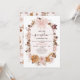 Fall themed floral, foliage and big pink bow first birthday invitation for a baby girl featuring a lovely arrangement in autumn and pink colors. This a little pumpkin birthday invitation also features a large pink bow, a beige frame and modern calligraphy heading. Ideal for someone looking for a rustic fall birthday invitation for a baby girl but can be used for any age.