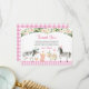 This cute birthday thank you card features watercolor farm animals with pink floral accents, confetti and a pink gingham border.