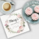 Soft blush pink roses and bright pink buds create a beautifully rustic floral wreath. White hydrangeas at to the floral bloom. The birthday woman's name is written in a large script font. 100th Birthday and the thank you sentiment follow. This birthday napkin is part of the 100th Birthday Pink Rose Floral collection. It contains many DIY templates that let you quickly create invitations and party supplies.