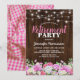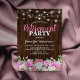 Country chic retirement party invitations featuring a rustic wood background, backyard string lights, elegant pink and white garden watercolor flowers, and a retiring celebration template that is easy to personalize.