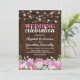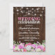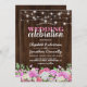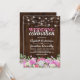 Country chic wedding invitations featuring a rustic wood background, backyard string lights, elegant pink and white garden watercolor flowers, and a wedding celebration template that is easy to personalize.
