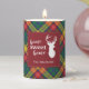 Cute home sweet home Christmas candle you can easily customize by clicking the "Personalize" button, Featuring and deer silhouette and clan Buchanan tartan in green, yellow, and red check.
