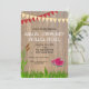 This potluck picnic invitation features a rustic design. Red and yellow plaid flag banners, grass, and watermelon accent the wood background.