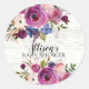Pretty baby shower favor seal featuring a watercolor plum & blue floral bouquet set on a rustic wood background