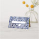 This design features rustic Portuguese tile patterns. On the reverse the bride and grooms names and wedding date is elegantly framed with a white and gold color geometric shape. Unique Azulejo blue and white floral wedding place card design with modern elements. Matching wedding invitations and other stationery items are also available. Easy to personalize with your details. Hand write your guest names and table number in the space provided.