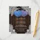 Provide your guests with important details with this rustic purple and blue floral wedding enclosure card featuring blue and purple hydrangea flowers on a barn wood background adorned with white floral lace. Two burlap hearts at the back.