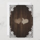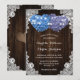 Rustic purple and blue floral wedding invitation featuring two floral hearts on a barn wood background adorned with white floral lace and string lights. Perfect card design for inviting your guests to your purple and blue rustic wedding party.
