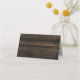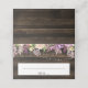 Rustic wedding folded place cards featuring greenery and lavender purple watercolor flowers with strings lights and a dark barn wood background. \\