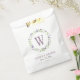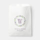 A charming wedding favor bag featuring a delicate purple and green wildflower wreath encircling a bold monogram initial. The couple's names and wedding date sit below in classic typography, with a dainty dotted border accent. All text and the monogram initial are fully customizable. Ideal for filling with candy, cookies, or small favors at your reception.