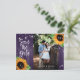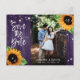Rustic floral wedding save the date photo postcards featuring sunflowers and string lights on a barn wood background. Ideal card design for a purple rustic wedding party inspired by sunflowers. Monogram wedding save the date postcard.